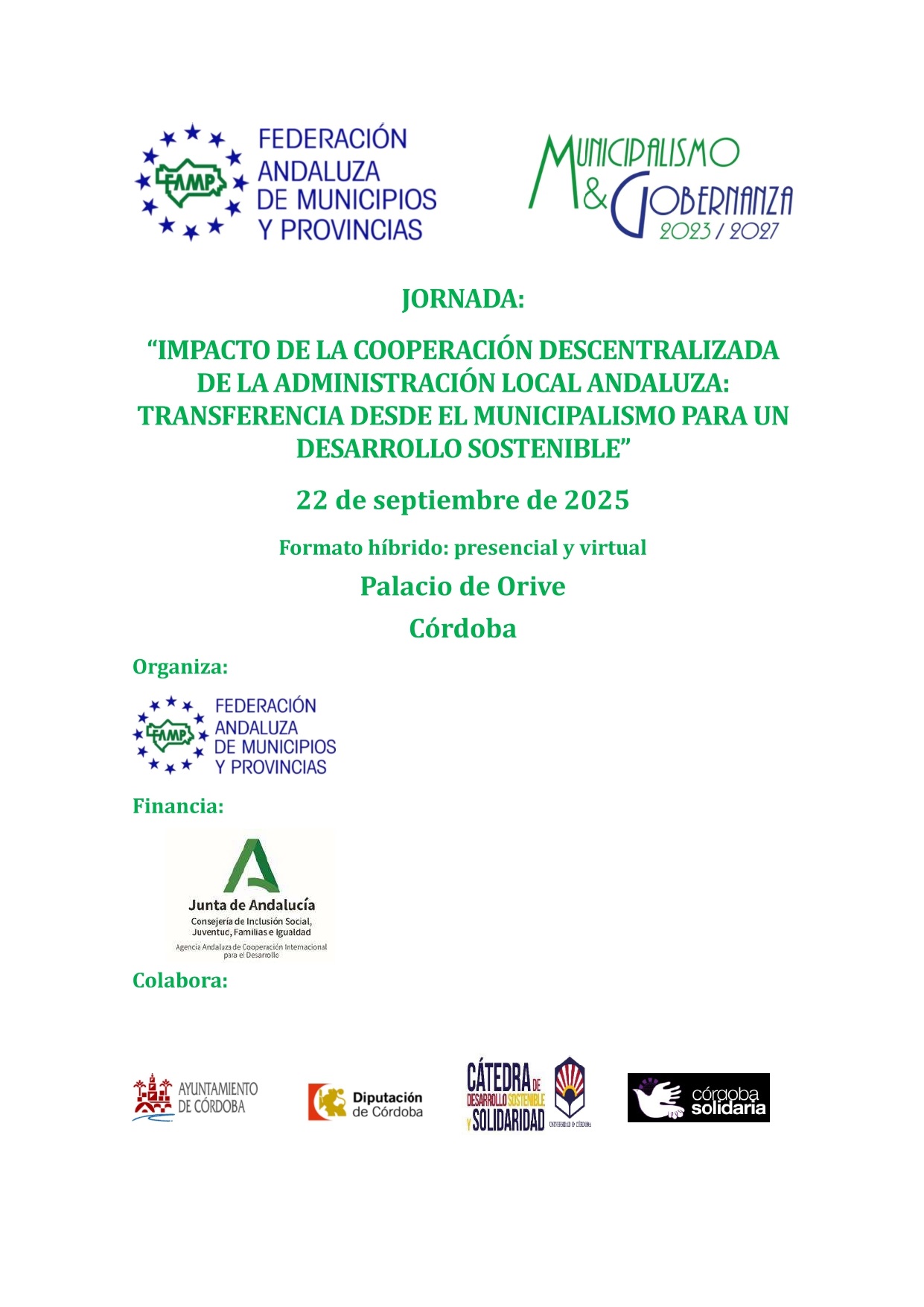 La Federación Andaluza de Municipios y Provincias celebra el próximo lunes, 22 de septiembre la Jornada “Impacto de la Cooperación Descentralizada de la Administración Local Andaluza: Transferencia desde el Municipalismo para un Desarrollo Sostenible” en el Palacio de Orive, Córdoba. Esta acción formativa financiada por la Consejería de Inclusión Social, Juventud, Familia e Igualdad de la Junta de Andalucía a través de la Agencia Andaluza de Cooperación Internacional para el Desarrollo; se desarrollará en formato híbrido (presencial y virtual), y está dirigida al personal técnico y empleados públicos de las distintas administraciones y responsables políticos de gobiernos locales así como personas vinculadas al movimiento asociativo de ONGDs y personal de universidad que desarrollan su trabajo en la Cooperación Internacional para el Desarrollo.