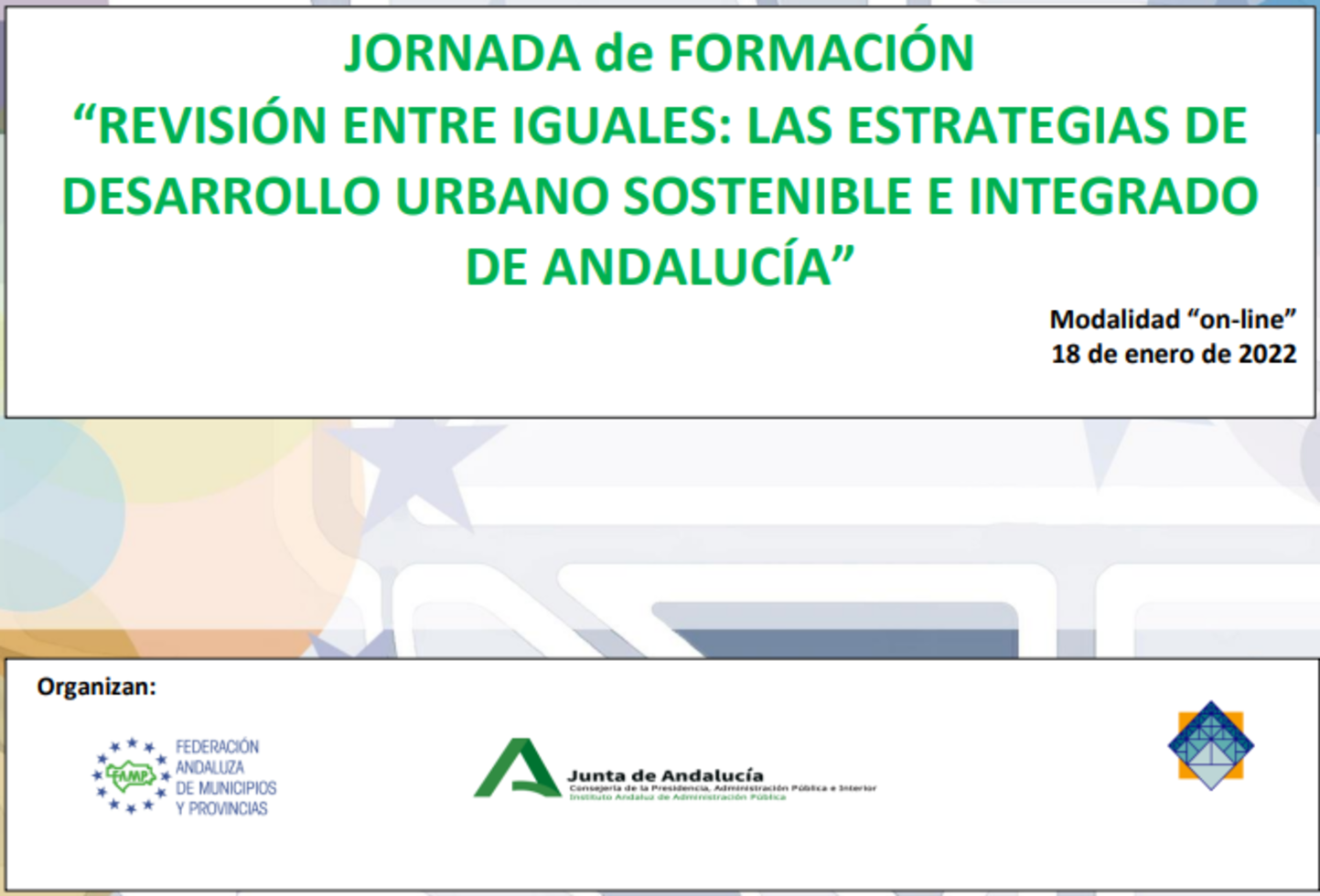 Generar un espacio de contacto, debate y posible consenso sobre todos aquellos temas que afectan a nuestras ciudades en sus estrategias de desarrollo sostenible. Intercambiar opiniones sobre los aspectos más operativos vinculados tanto al diseño como gestión de las EDUSI aprobadas o en trámite de aprobación. Generar conocimiento compartido sobre temas de interés común, sobre la base delas experiencias particulares de cada uno de los participantes. Conocer, de mano de sus promotores, las estrategias de desarrollo urbano que tienen planteadas o que están siendo ejecutadas por diferentes ciudades andaluzas.
